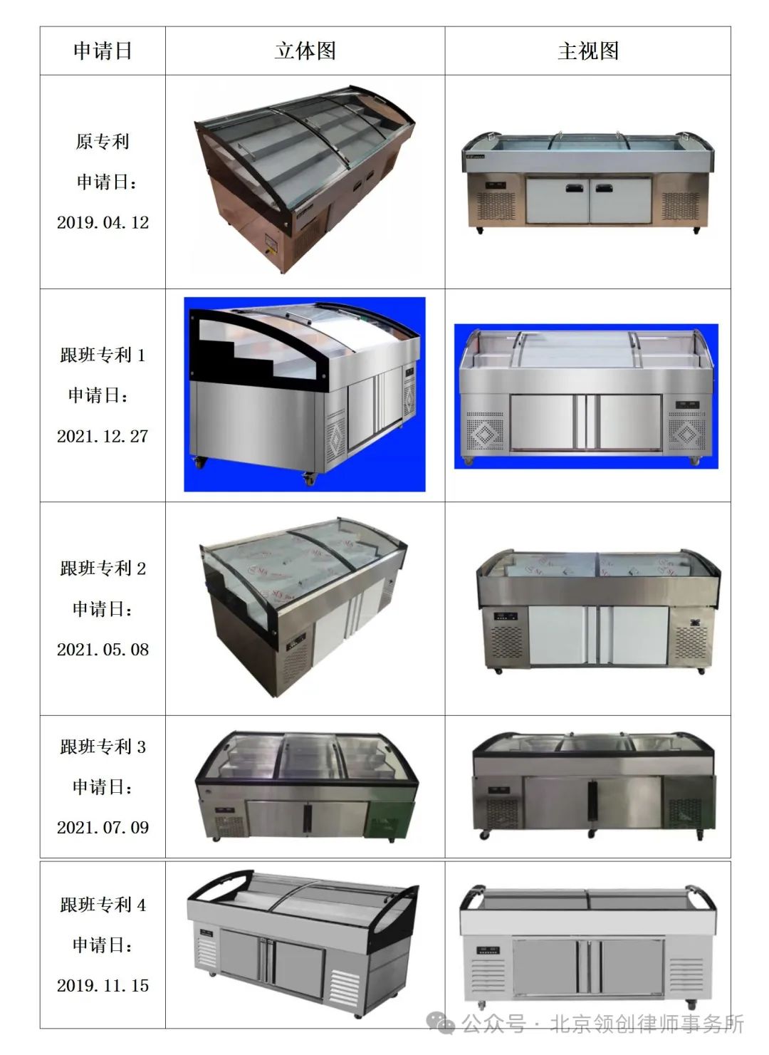 我們可(kě)以明确的看出,本冷藏櫃由上下兩部分(fēn)構成,上部分(fēn)為(wèi)透明玻璃罩,下部分(fēn)為(wèi)基櫃,透明玻璃罩設置在基櫃之上,比基櫃面積略大,整體(tǐ)呈現通透的一覽無餘的觀感。跟班專利沒有(yǒu)改變主要設計要點和整體(tǐ)觀感的前提下,僅僅改變玻璃門滑動配合方式(層疊式滑動、平開左右式滑動)、玻璃門數量(根據櫃體(tǐ)寬度選擇2或3)、玻璃門把手的形狀(如過橋式把手、紐扣陣列式把手、條形把手)、增減玻璃門把手數量、對基櫃上的壓縮機通風窗的位置進行前後左右的替代性置換,通風窗的通風孔改變孔徑大小(xiǎo)及陣列形狀。這些變化屬于細微處的改變,并不能(néng)給一般消費者帶來實質(zhì)不同的體(tǐ)驗。